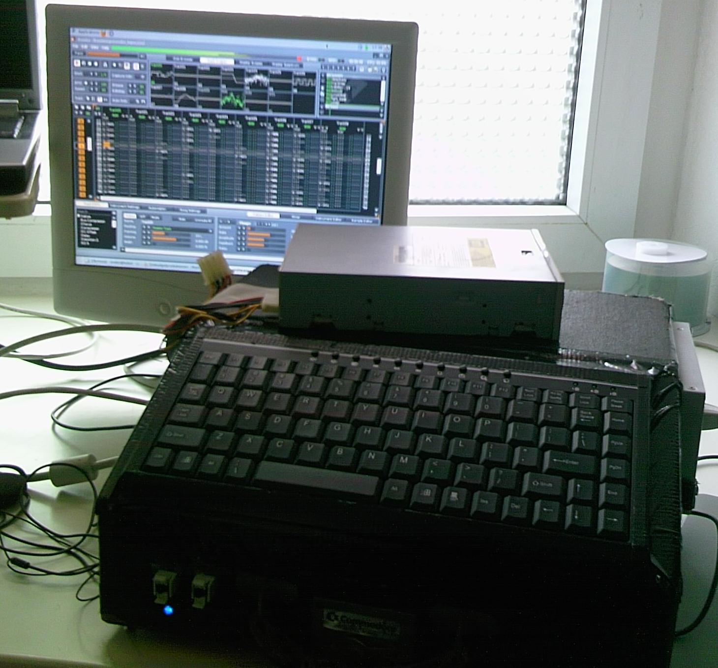 märz 08 / oben seht ihr eine frisch installierte schreibmaschine mit ubuntu hardy heron beta (server cd + nachträglich xface4 und alsa) und renoise linux 1.9.1 RC. ich mußte erst noch ein externes cd-rom andocken um ubuntu neu zu installieren. beim 1. versuch hab ich wohl ein kabel in den lüfter geklemmt und mir später an der cpu fast eine brandblase geholt. mit etwas pusten, kabel sortieren und neuer hoffnung hats dann geklappt. computer basteln tu ich irgendwie öfter als php lernen, was ich eigentlich sollte...
